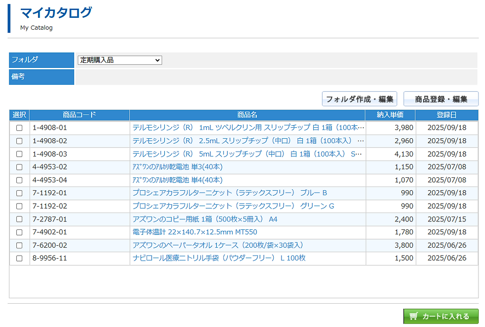 よくご購入頂く商品をマイカタログに登録しておくことができます。マイカタログに登録した商品は次回以降、簡単に発注できますので、日々の調達業務を効率的に行っていただくことが可能です。