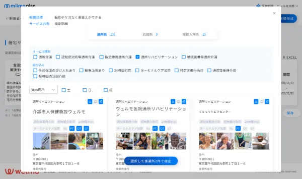 弊社の地域ケア情報データベース「ミルモネット」と連携し、短期目標とサービス内容から事業所を提案します。さらに、絞り込み機能でご利用者様の状況にあった事業所を探すことができます。