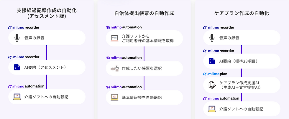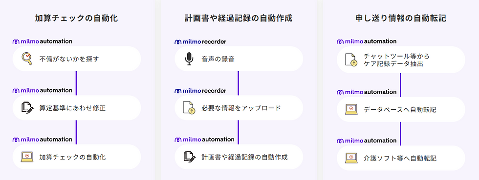 RPAで介護ソフトとの連携をしながら、AIや簡易アプリを使って様々な施設でご利用できるソリューションを提供します。